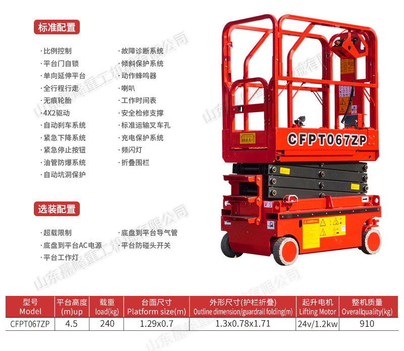 工作高度6米,安全载重240KG,整机重量只有910KG